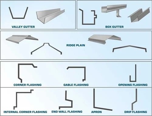 Single Skin Roofing, Corner Flashing, Apron Flashing, S Type Louvers, Eaves Gutters, Eves Flashing, Gutter Flashing, Wall Flashing, Valley Gutters, North Light Curve, Barge Boards (Gabel End Flashing), Cladding Bottom Flashing, Cap flashing, Expansion Joint In Two Piece